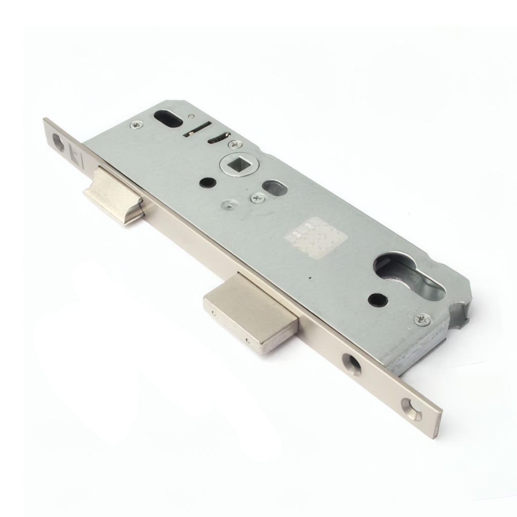 Врезные замки для дверей из ПВХ профиля. Ассортимент представлен моделями с роликовым фиксатором (индекс "R") и моделями под ручку с фалевой защелкой. Замки имеют сертификат соответствия согласно ГОСТ 5089-2011. Замки не комплектуются ответной планкой. Удаление ключевого отверстия (Backset): 25, 30, 35, 40 и 45 мм. В корпусах с Backset 35, 40, 45 мм имеются отверстия для крепления раздельных ручек стяжными винтами, посадочный размер 38 мм.