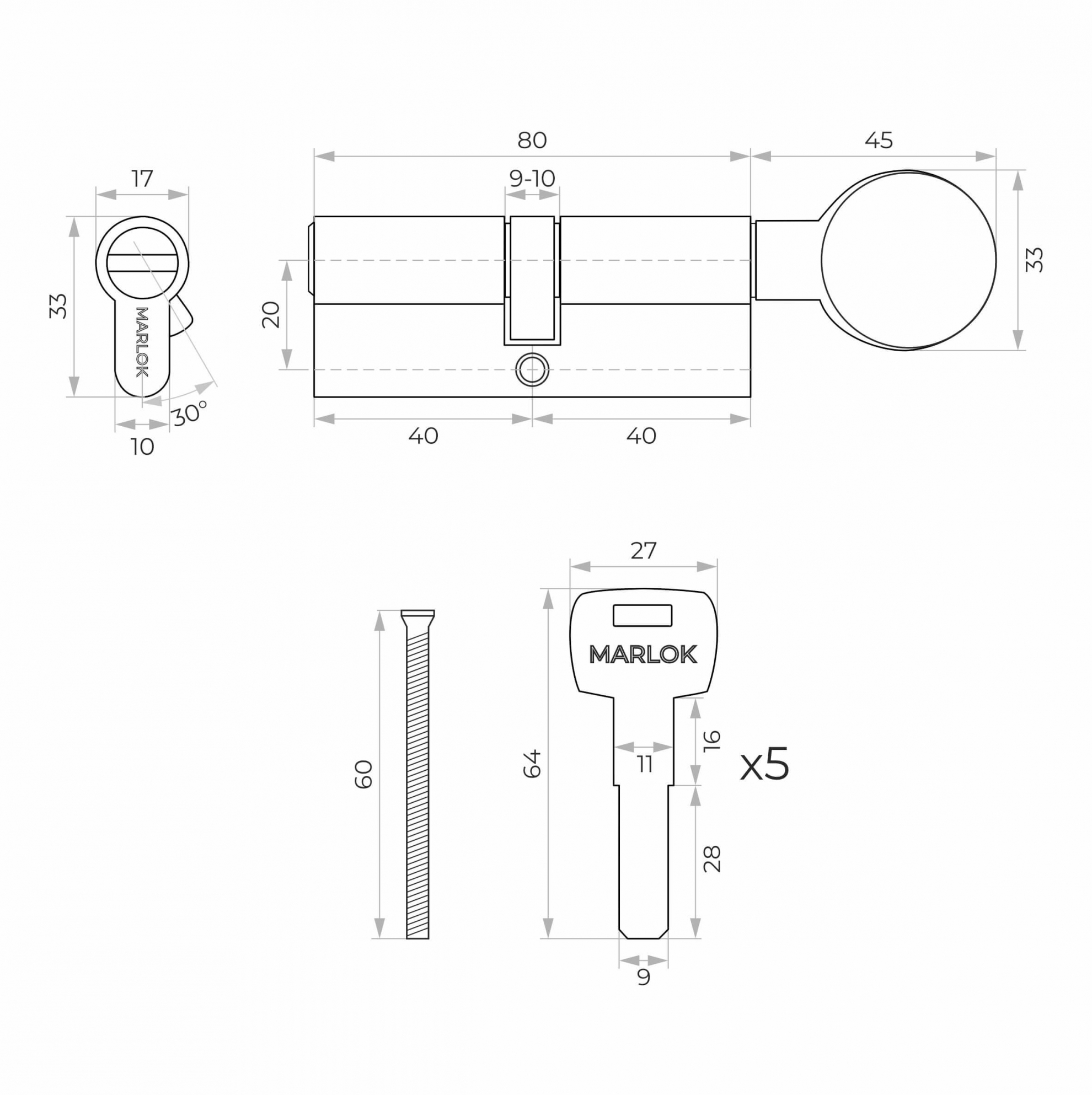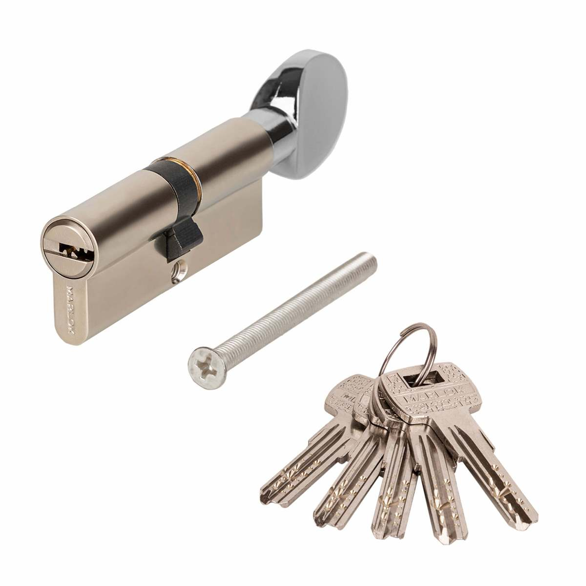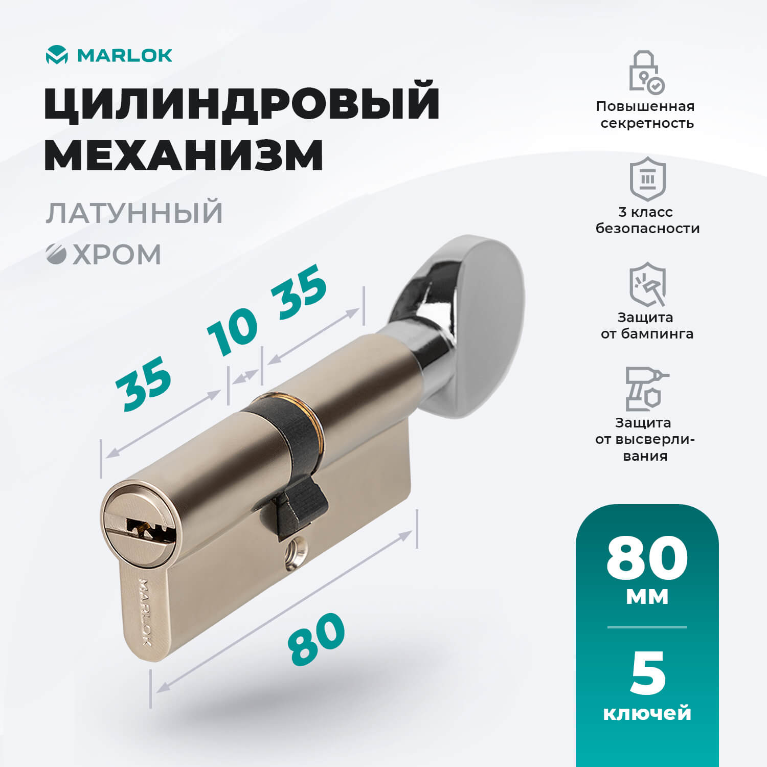 Цилиндры Marlok 80(40В/40)-5K разработаны для врезных замков под евроцилиндр без смещения. Предназначен для установки в металлические входные двери.Обеспечивают высокую безопасность благодаря следующим характеристикам: