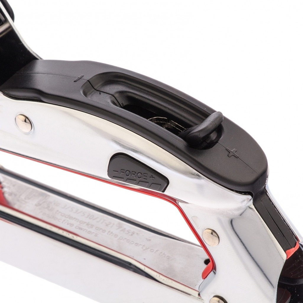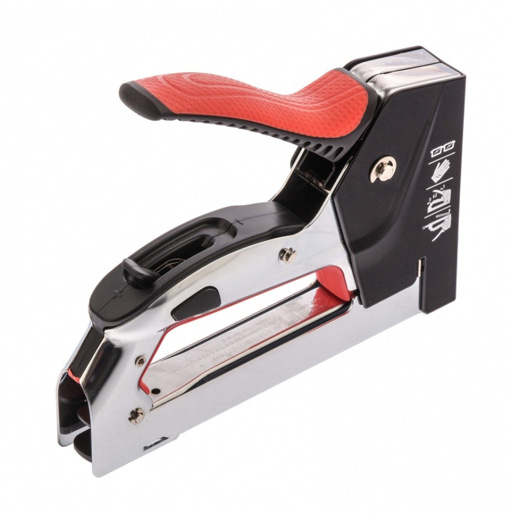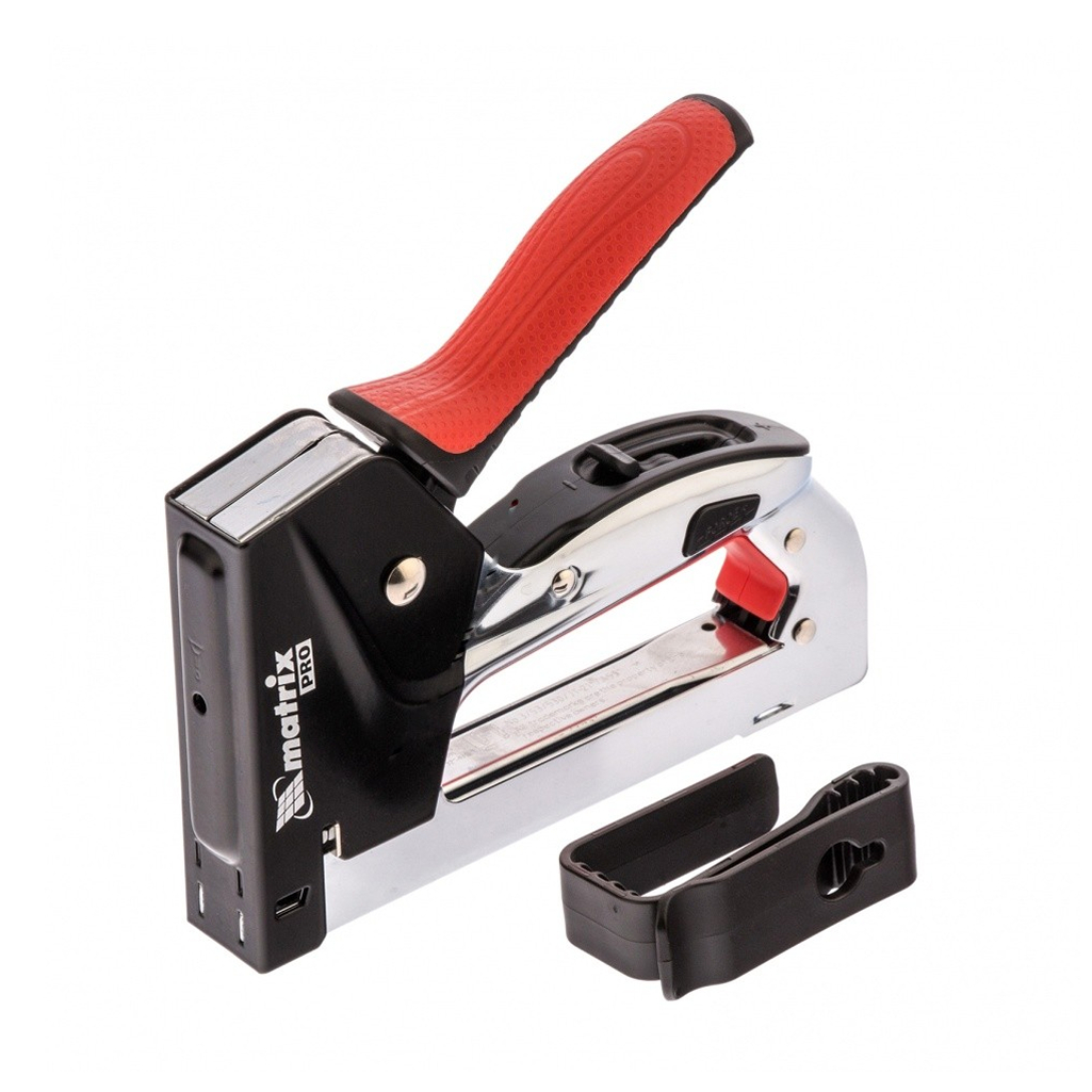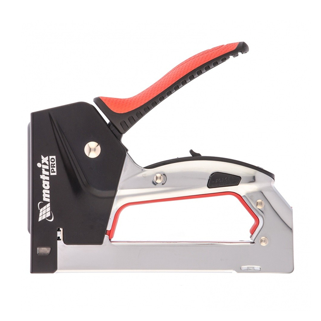 Стальной мебельный степлер Matrix PRO с быстрой загрузкой скоб типа 53 размером 4-14 мм помогает оперативно закрепить на деревянном основании фанеру, оргалит, ДВП, ДСП, ПВХ-пленку или теплоизоляционный материал. Двухпозиционный регулятор силы удара позволяет устанавливать глубину забивания скобы в зависимости от твердости скрепляемых материалов. Входящий в комплект крючок служит для ношения степлера на ремне. Инструмент подходит для сборки или обивки мебели, укладки ковровых покрытий, проведения ремонтных и отделочных работ.