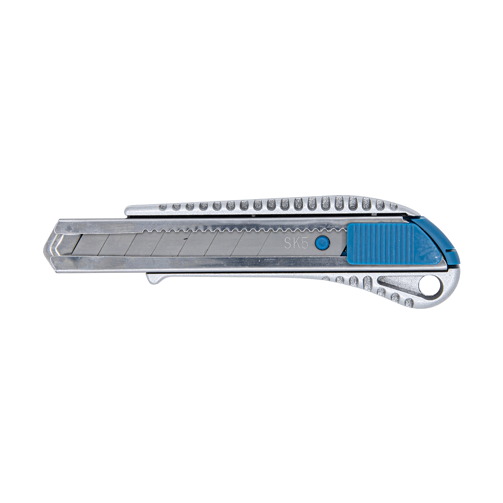 Предназначен для работы сменными сегментированными лезвиями шириной 18 мм для разрезания пленки, плотной бумаги, картона и других тонких неплотных материалов. Оснащен металлической направляющей и сдвижным фиксатором лезвия. Материал корпуса - алюминиевый сплав со вставками из термопластичной резины.