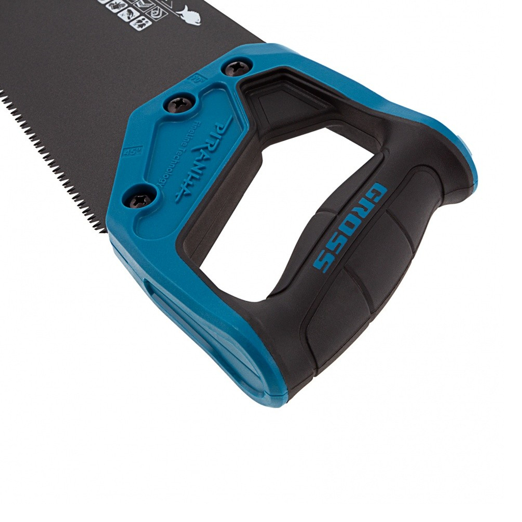 Ножовка по дереву Gross PIRANHA с полотном длиной 400 мм, калеными зубьями с 3D-заточкой и шагом 11-12 TPI, тефлоновым покрытием полотна и 2-компонентной рукояткой, используется для продольного и поперечного распиливания древесины различных пород, МДФ, ДСП, ДВП, ламината, а также пенополистирола, полиуретана и других синтетических материалов. Рабочая часть состоит из мелких зубьев с шагом 2-2,3 мм, что позволяет получить ровный и чистый рез. Трехгранная заточка зубьев увеличивает производительность инструмента без потери качества распиловки. Ножовка предназначена для столярных работ.
