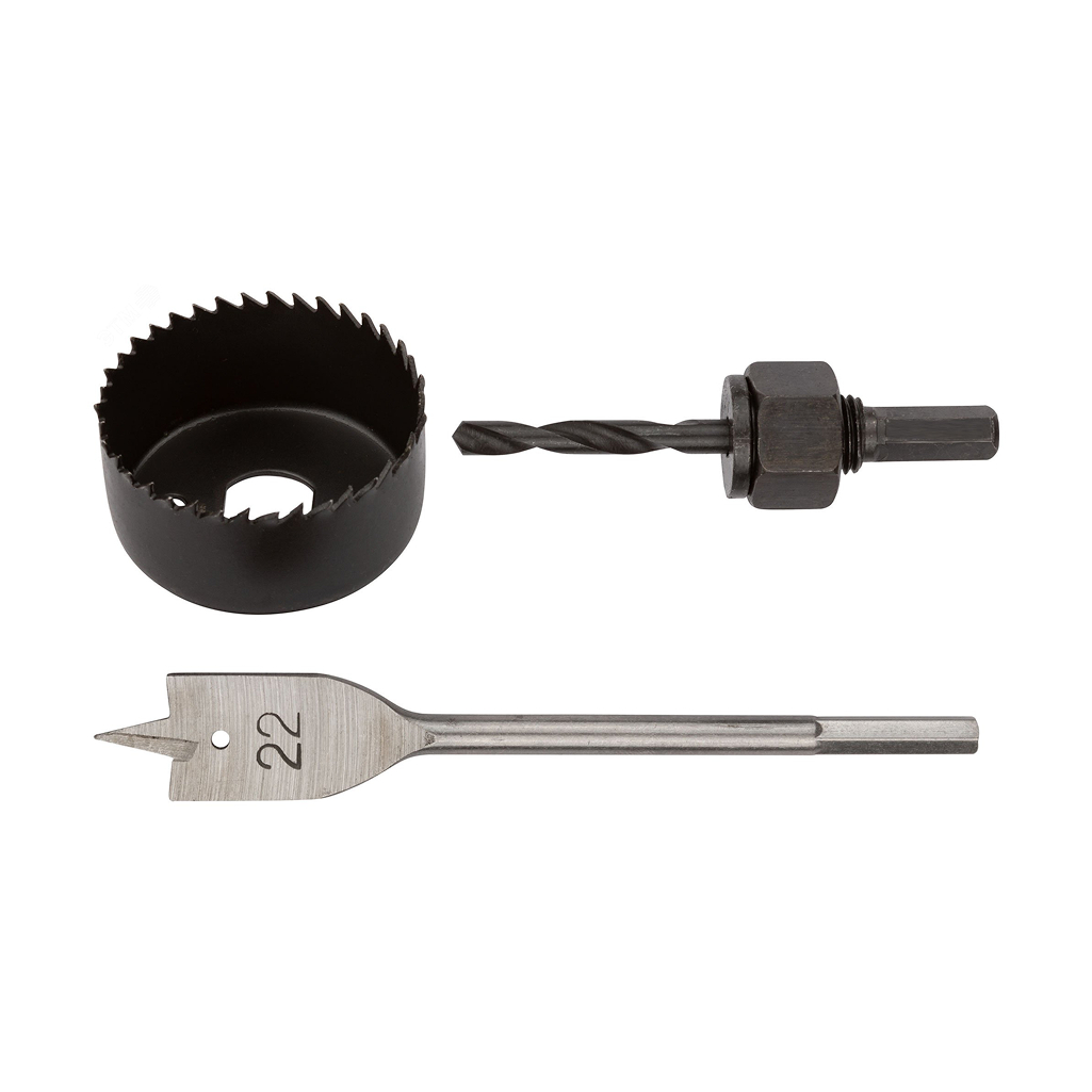 Набор для врезки замков КУРС предназначен для работ по дереву, фанере, ДСП. В наборе представлены все необходимые инструменты для быстрой установки замка - коронка, направляющее сверло, перовое сверло. Центрирующее сверло обеспечивает точное позиционирование коронки, исключая ее смещение во время работы. Разводка зубьев на коронке обеспечивает высокую скорость пропила. Шестигранный хвостовик на адаптере и перовом сверле предотвращает проскальзывание в патроне электроинструмента.