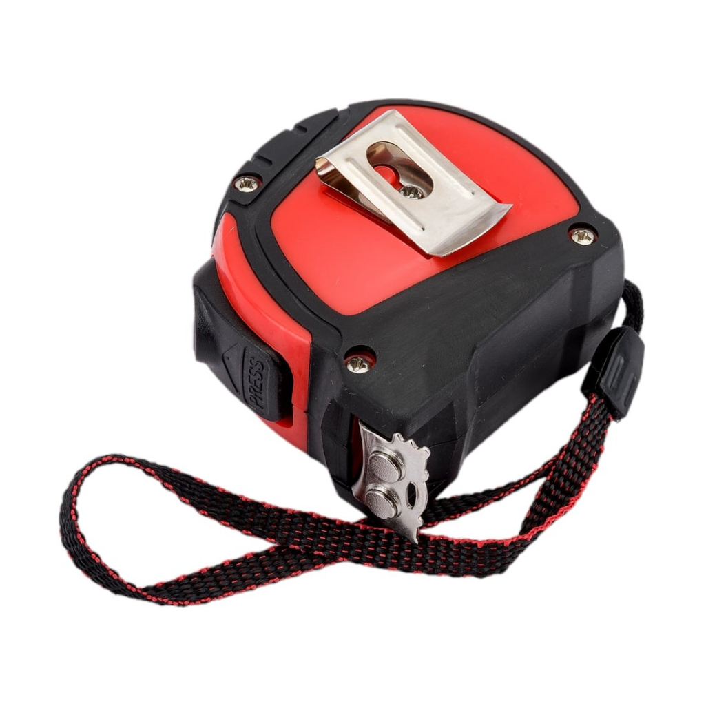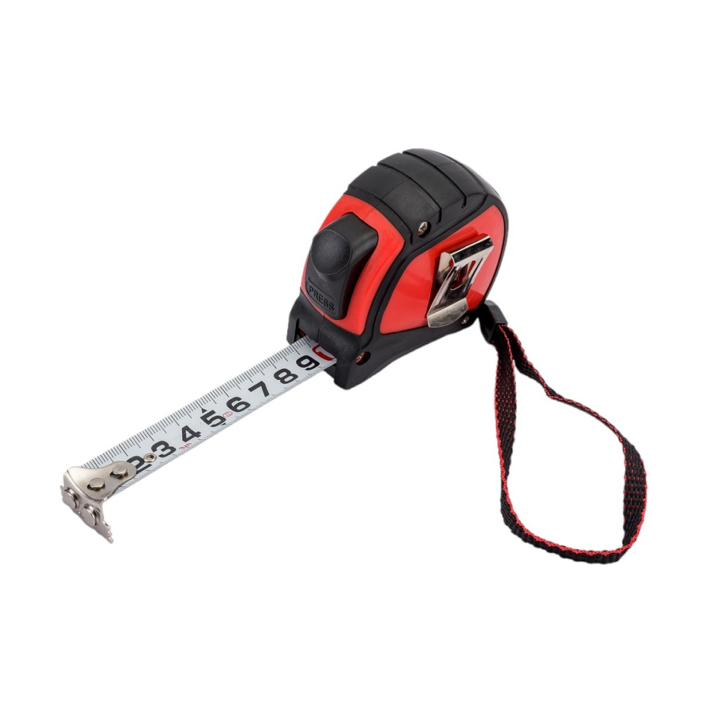 Рулетка с магнитом поставляется в корпусе с элементами из эко-резины без запаха. Инструмент оснащен отверстием для зацепа на гвоздь. Есть мощная возвратная пружина.