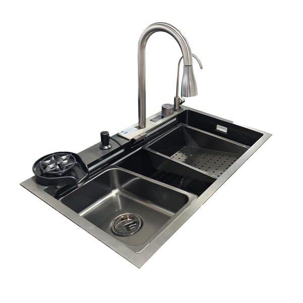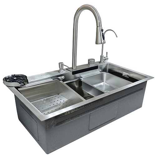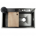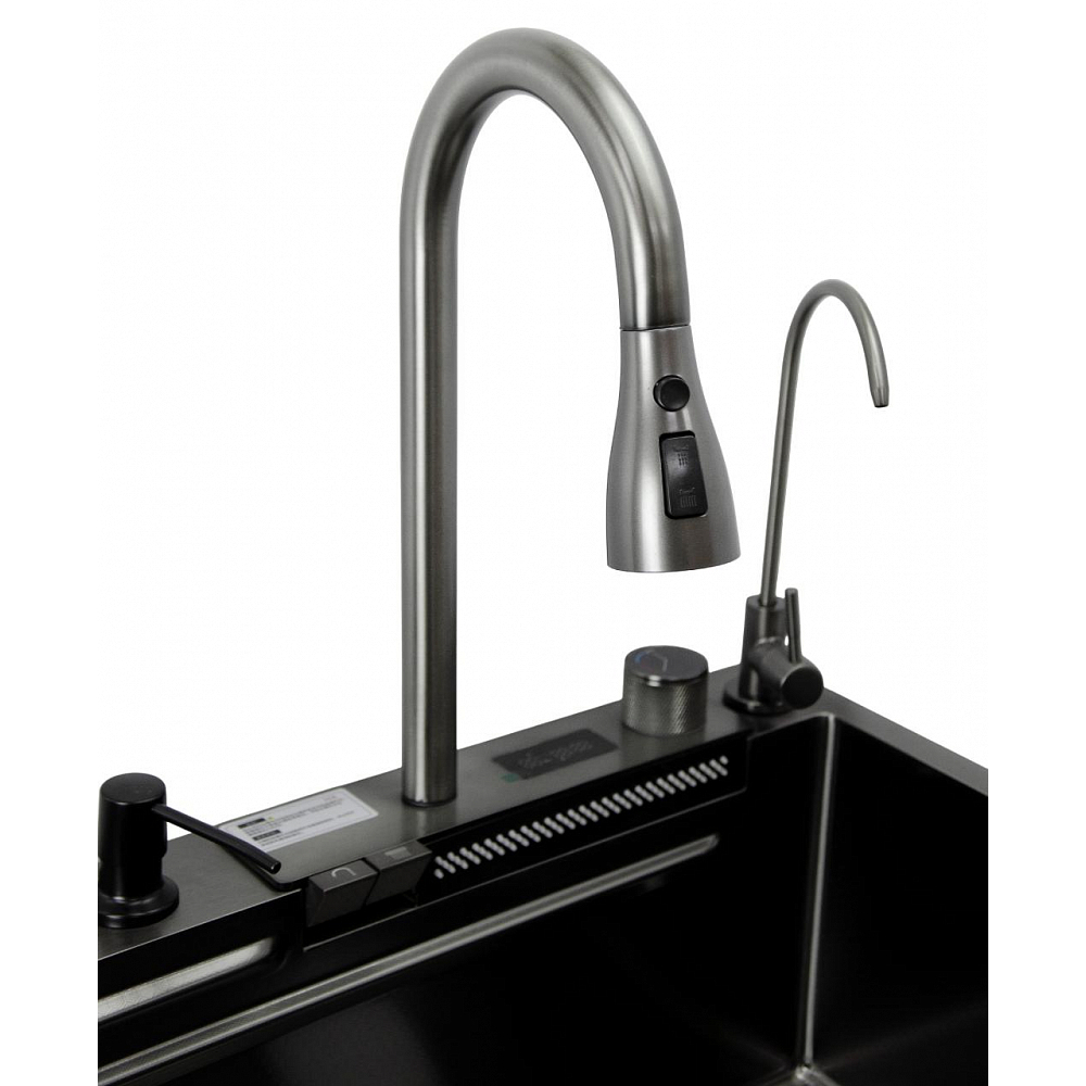 Мойка, комбинированный двойной термостатический смеситель с выдвижной лейкой + водопад, 2 колландера, ополаскиватель стаканов, дозатор, кран для питьевой воды, разделочная доска и 3 1/2'' сифон