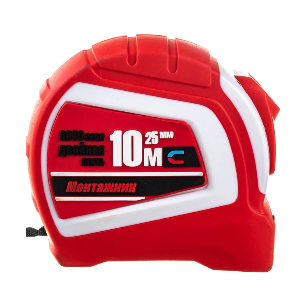 Рулетка с автостопом и магнитом Монтажник двусторонняя 10 м х 25 мм представляет собой удобный инструмент для работы в любой плоскости. Благодаря использованию двустороннего захвата и наличию разметки с обеих сторон. Удобный корпус хорошо ложится в ладонь и не скользит. Это ускоряет процесс измерений.