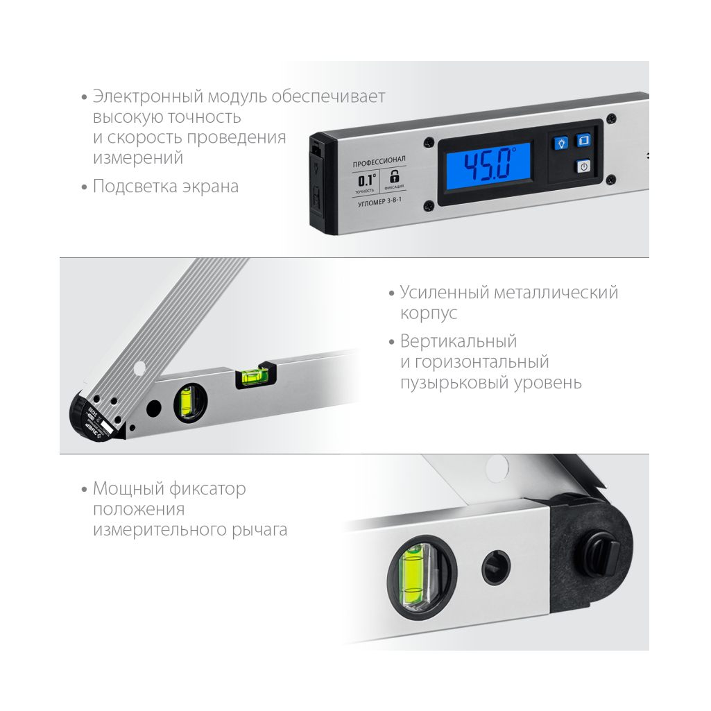 Предназначен для профессионального применения. Изготовлен на прецизионном оборудовании, что обеспечивает высокую точность при измерении углов. Применяется для измерительных и разметочных работ и контроля выставленных под углом конструкций.