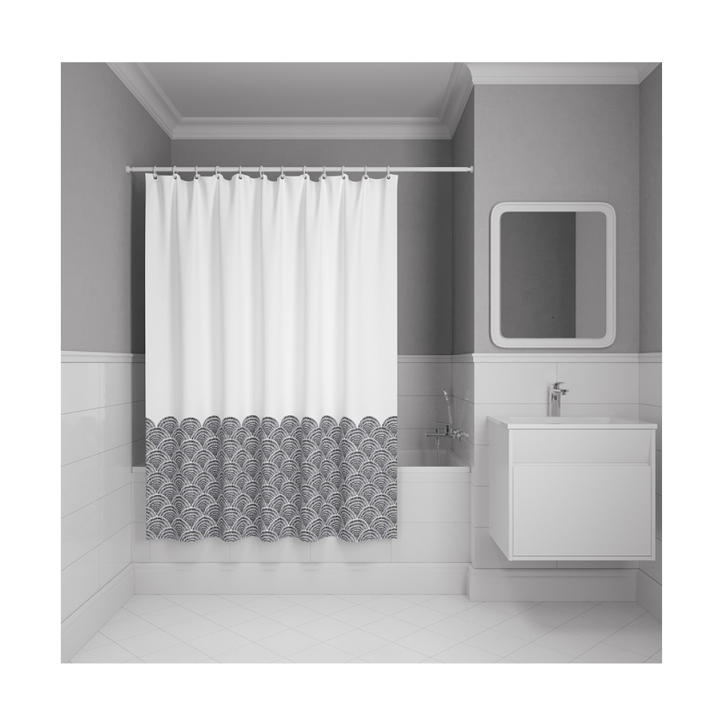 Текстильная штора для ванной белого цвета с серым принтом в виде волн в средиземноморском стиле. Штора освежит пространство и привнесет в него легкое настроение.