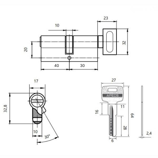 Цилиндровый механизм (личинка) 70мм Apecs SC-70(30С/40)-C-Ni с вертушком, никель