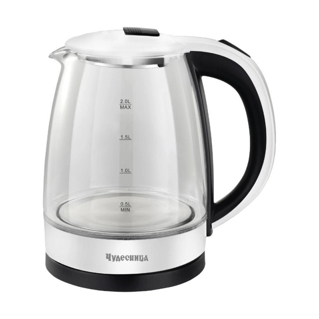 Электрический чайник Чудесница ЭЧ-2039 предназначен для кипячения воды дома, в офисе, на даче. Корпус чайника выполнен из стекла и пластика. Внутренняя поверхность состоит из стекла, благодаря чему вода не соприкасается с пластиком. Кнопка открывания крышки расположена на самой крышке. Чайник автоматически отключается при закипании, имеет защиту от перегрева и от включения без воды. Для удобства использования кнопки включения и выключения чайника находится на ручке чайника. Ручка пластиковая, не нагревается и удобно лежит в руке.