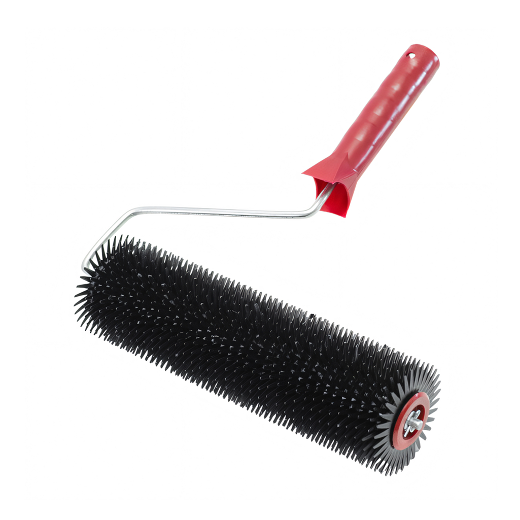 Изготовлен из пластмассы. Шип 10 мм с закруглением. Предназначен для прокатывания неотвержденных лицевых слоев наливных полов, стяжек с целью удаления воздуха.
