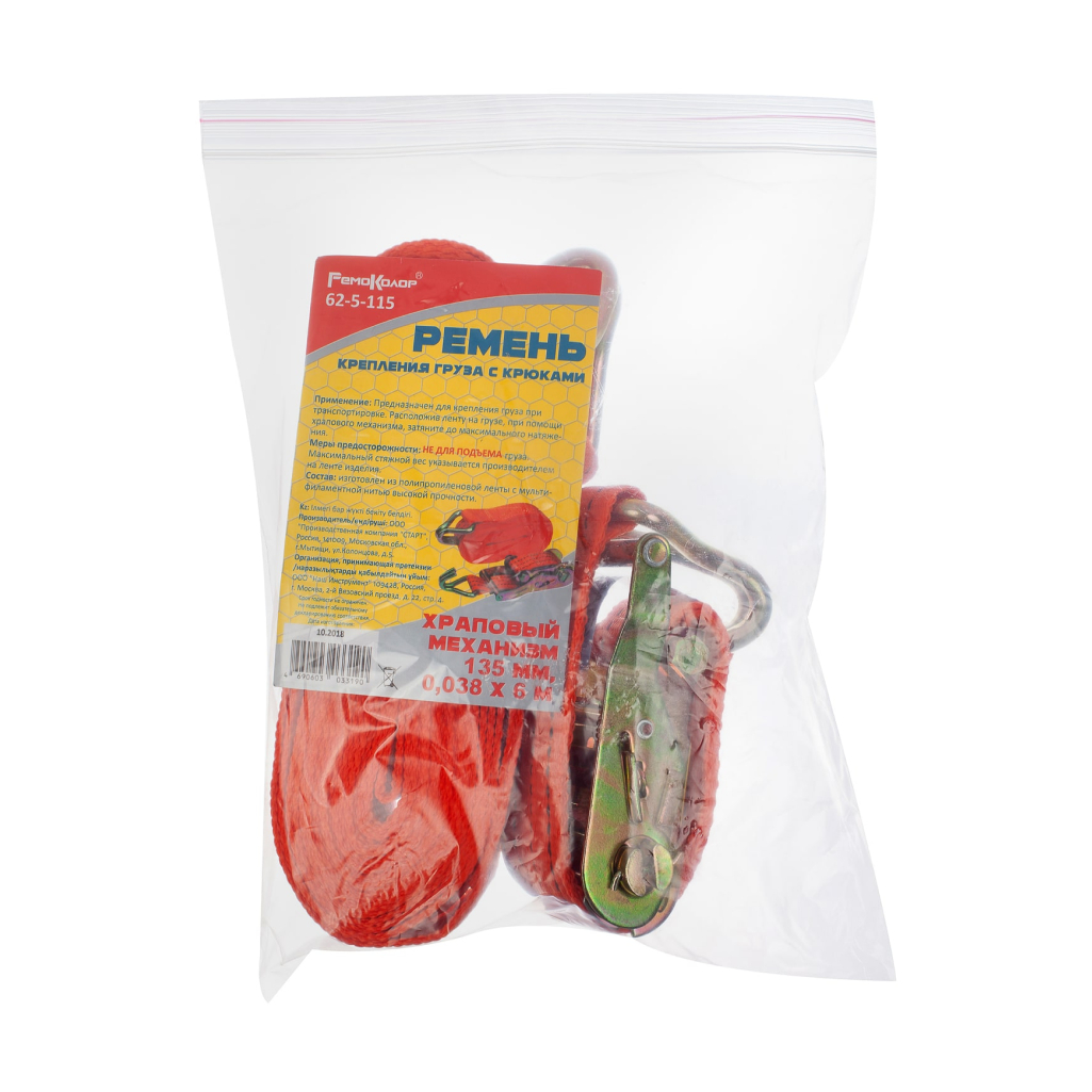 Ремень крепления груза Ремоколор с крюками 0,038х6 м с храповым механизмом (62-5-115)