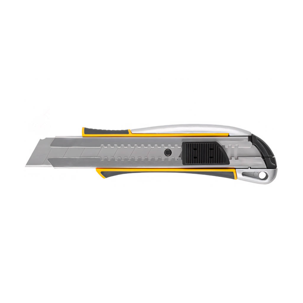 "Отламывающееся" лезвие с пластиковым прижимом. Дополнительный вращающийся прижим для блокировки лезвия. Металлическая направляющая с двусторонней автофиксацией для усиления конструкции. Материал: прорезиненный корпус из алюминиевого сплава с ударопрочными вставками из ABS пластика, лезвие из высокоуглеродистой стали.