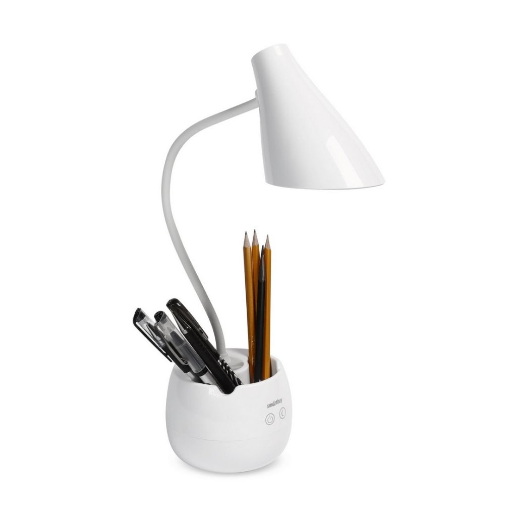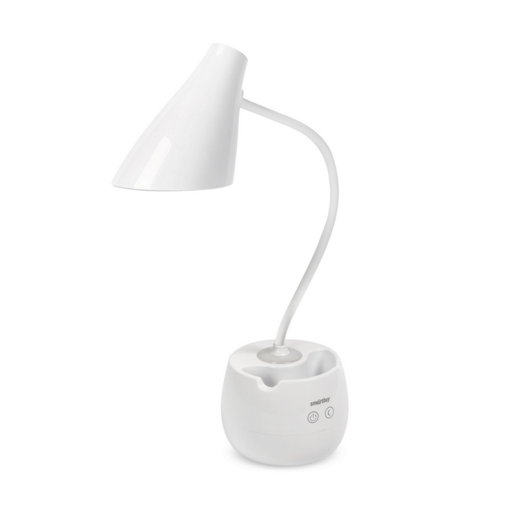 Настольный светильник Smartbuy сделан из пластика и имеет пластиковый плафон. Для управления используются механические кнопки. Для подключения к бытовой сети 220 В используется шнур длиной 120см.