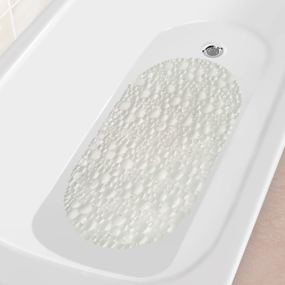 Изделие удобно ложится на дно ванны, повторяя её контуры, и надёжно фиксируется благодаря множеству равномерно распределённых присосок на обратной стороне.