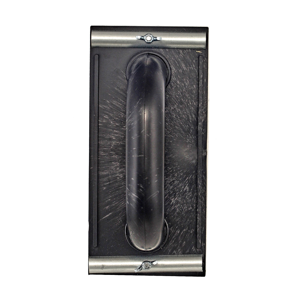 Пластиковое основание, накладка из мягкой синтетической резины черного цвета, металлические зажимы для крепления абразивных материалов на терке. Применение: для финишной обработки, шлифовки и полировки различных поверхностей.