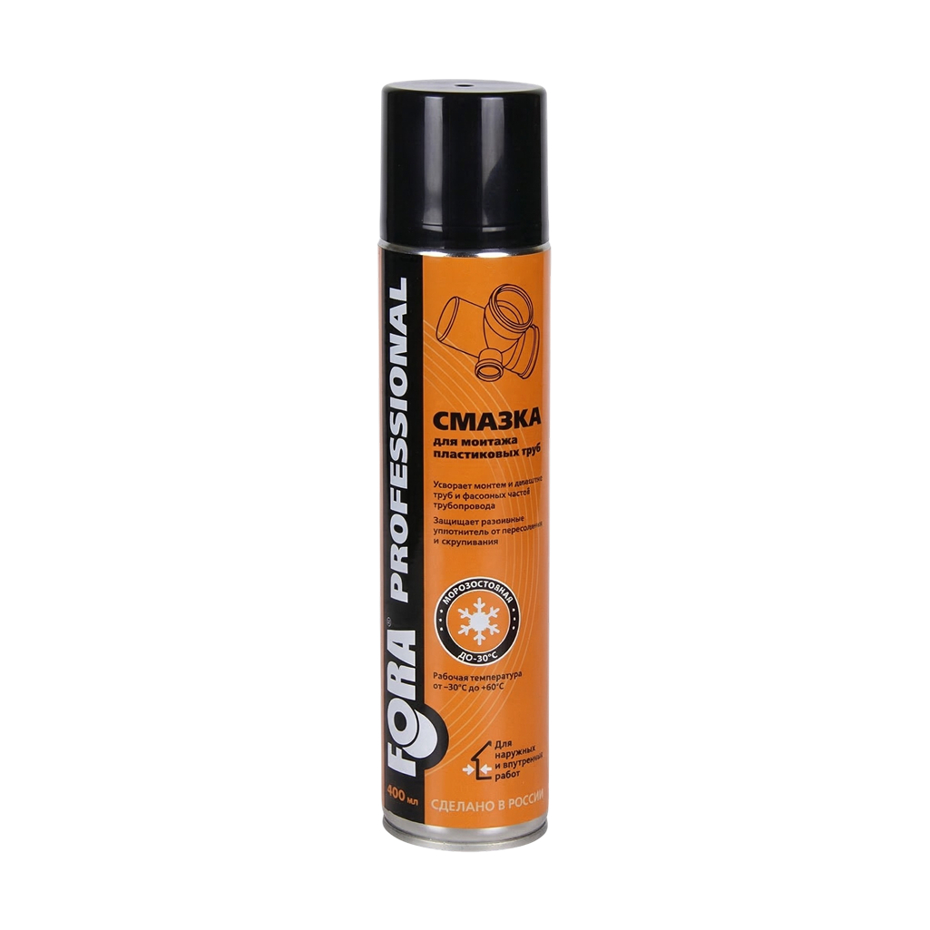 Силиконовая смазка Fora в аэрозоле для монтажа пластиковых труб систем канализации, дренажа и водоотведения, ускоряет монтаж и демонтаж труб и фасонных частей трубопровода, защищает резиновые уплотнители от пересыхания и скручивания. Характеризуется высокой смазывающей способностью и не вымывается водой, обеспечивая эффективную герметизацию резинового уплотнения.