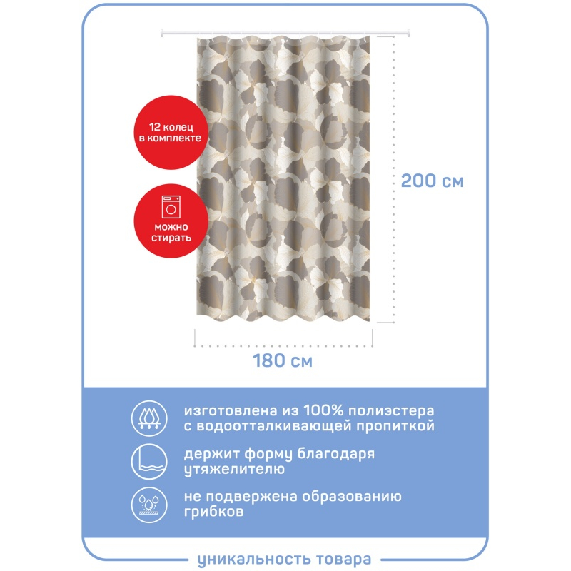 Шторка для ванной комнаты от Master House изготовлена из полиэстера с водоотталкивающим покрытием. Штора имеет утяжелитель внизу, который позволяет избежать задирания ткани, люверсы из прозрачного полипропилена и кольца для крепления на карниз (12 шт.). Размер шторы 180*200 см (ширина х высота).