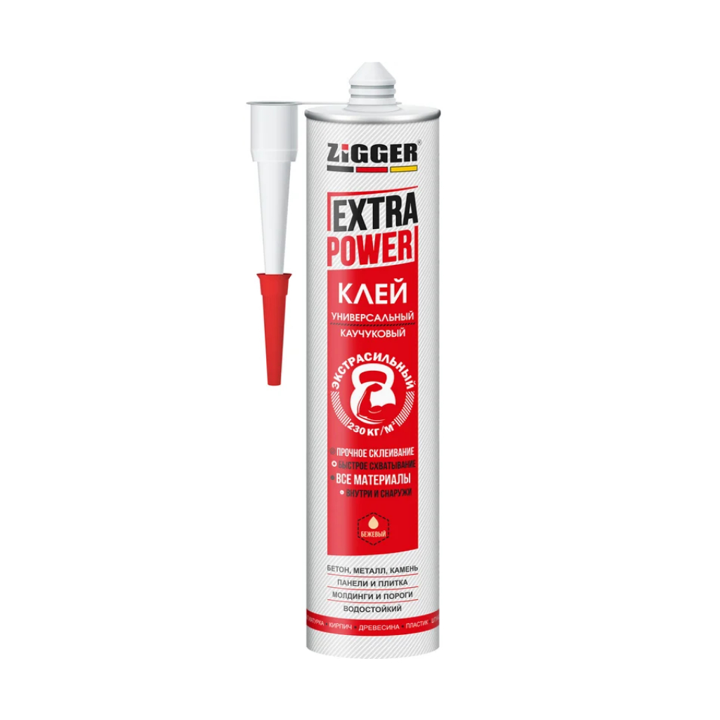 Клей Zigger Extra Power прочно склеивает поверхности из бетона, пластика, керамики, металлов, дерева, ОСБ, ДВП, ДСП, ПВХ, полиуретана, кирпича. Представляет собой клей усиленного действия на каучуковой основе. Быстрое и сильное начальное схватывание. Создает прочное, водостойкое соединение с термостойкостью от -30°С до + 80°С.
