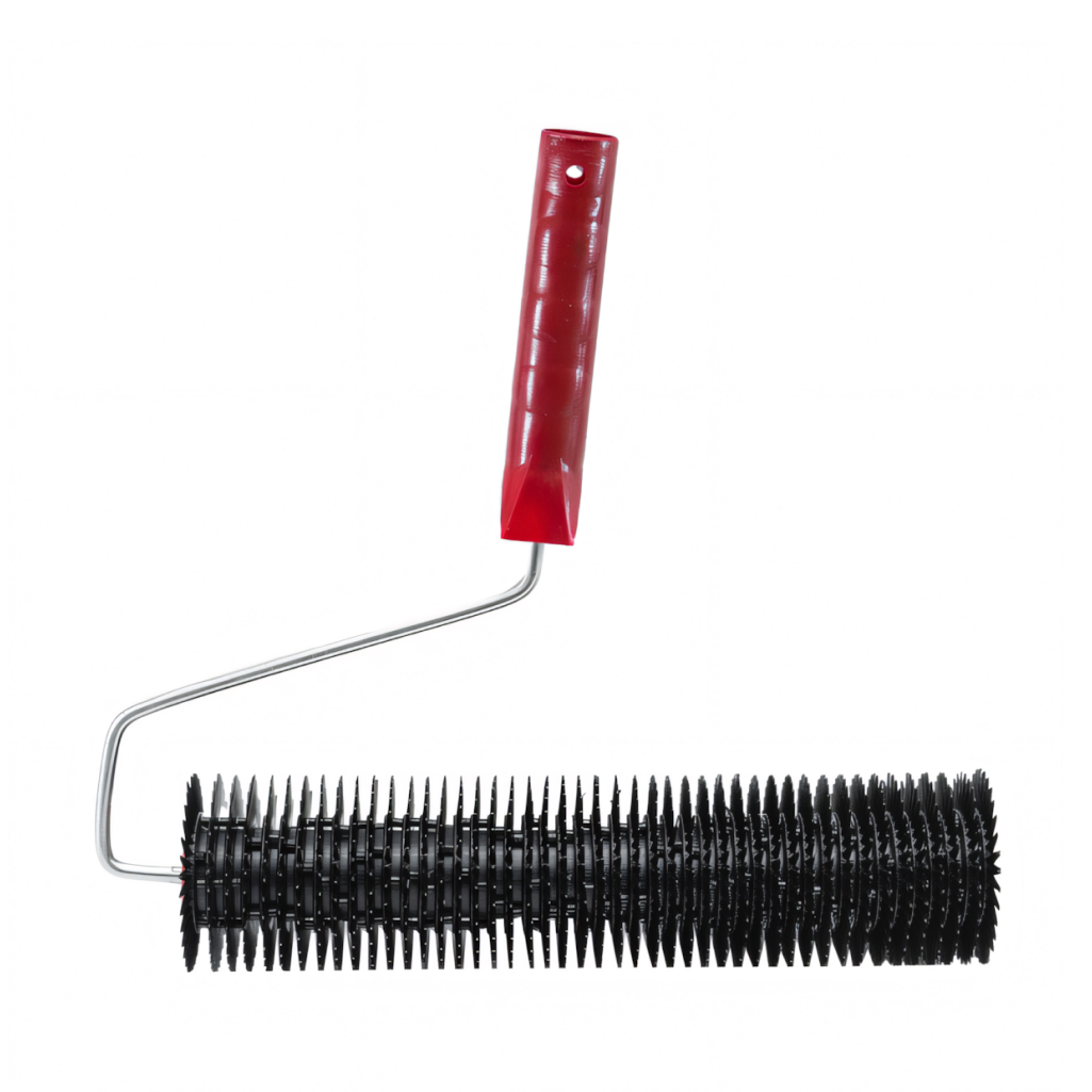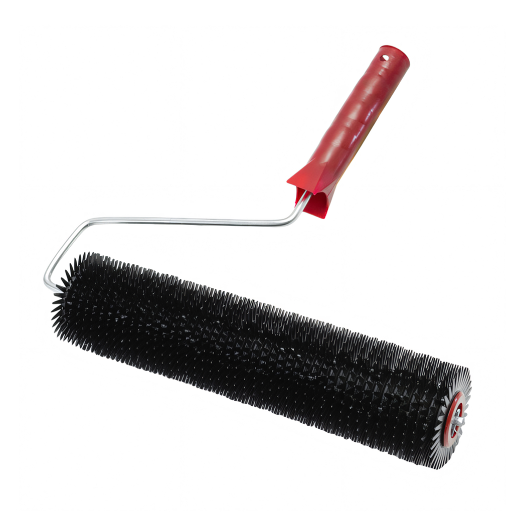 Изготовлен из пластмассы. Шип 10 мм с закруглением. Предназначен для прокатывания неотвержденных лицевых слоев наливных полов, стяжек с целью удаления воздуха.