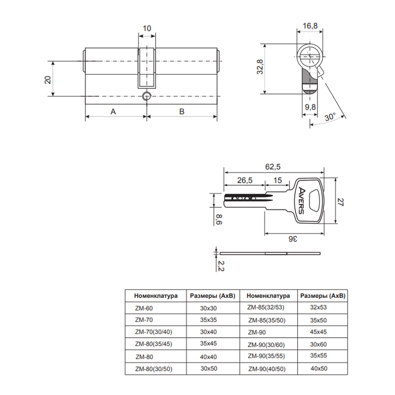 Цилиндровый механизм (личинка) 80 мм Avers ZM-80(30/50)-CR,хром