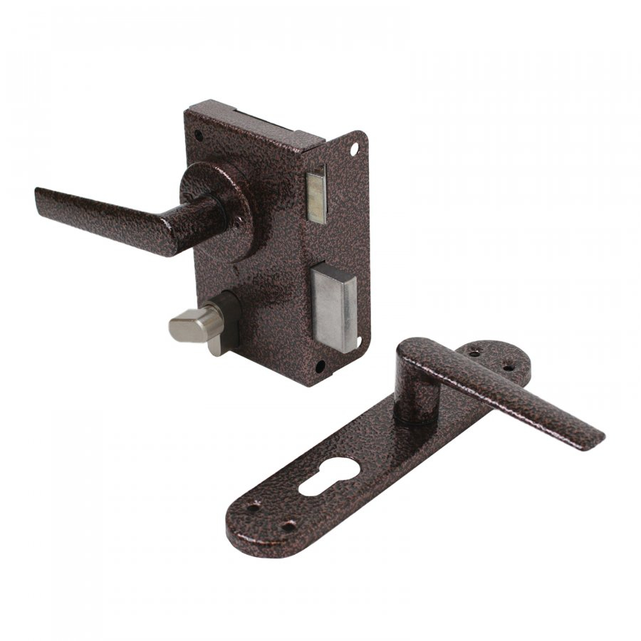 Замок накладной с ручками и цилиндровым механизмом. Предназначен для установки на деревянные и легкие металлические двери.