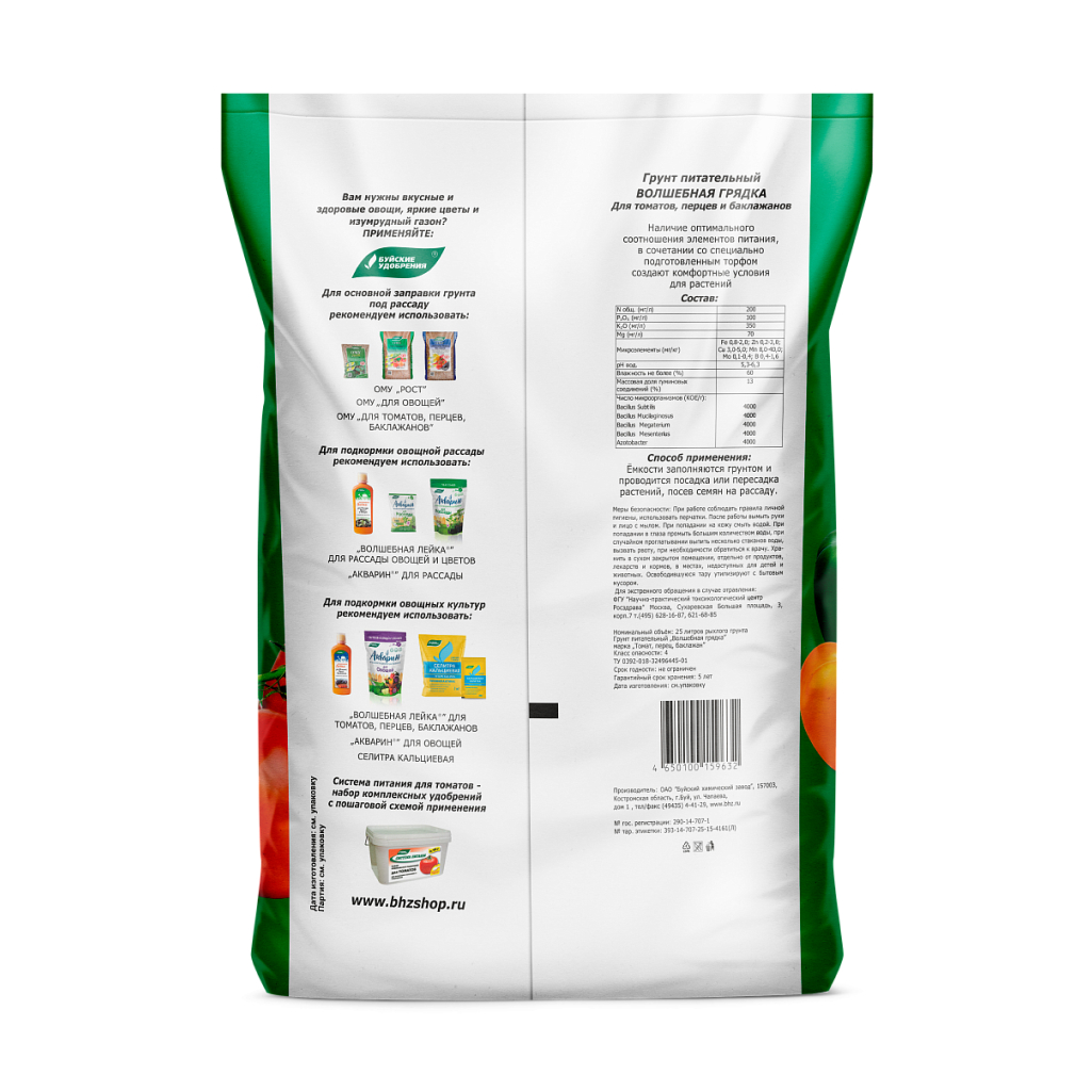 Грунт для выращивания томатов, перцев, баклажанов и других овощных культур. Приготовлен на основе нейтрализованного верхового торфа с добавлением в сбалансированном соотношении необходимых макро- и микроэлементов.