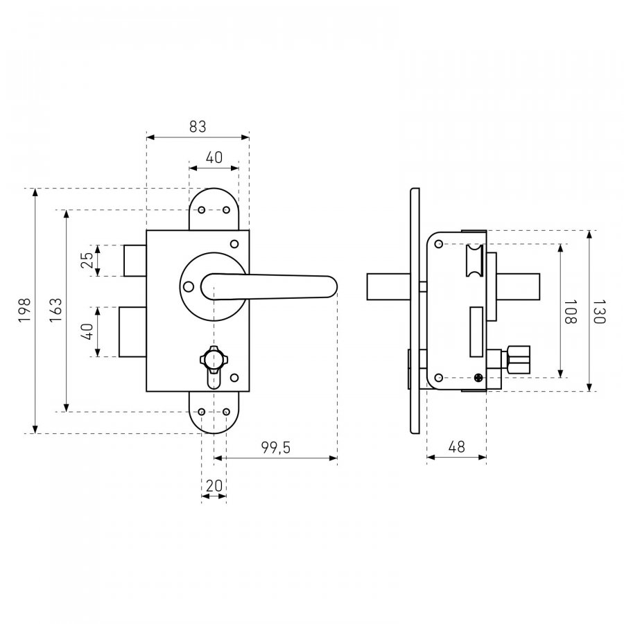 Замок накладной с ручками и цилиндровым механизмом. Предназначен для установки на деревянные и легкие металлические двери.