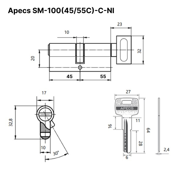 Цилиндровый механизм (личинка) Apecs SM-100(45/55С)-C-NI с вертушком 100 мм, никель
