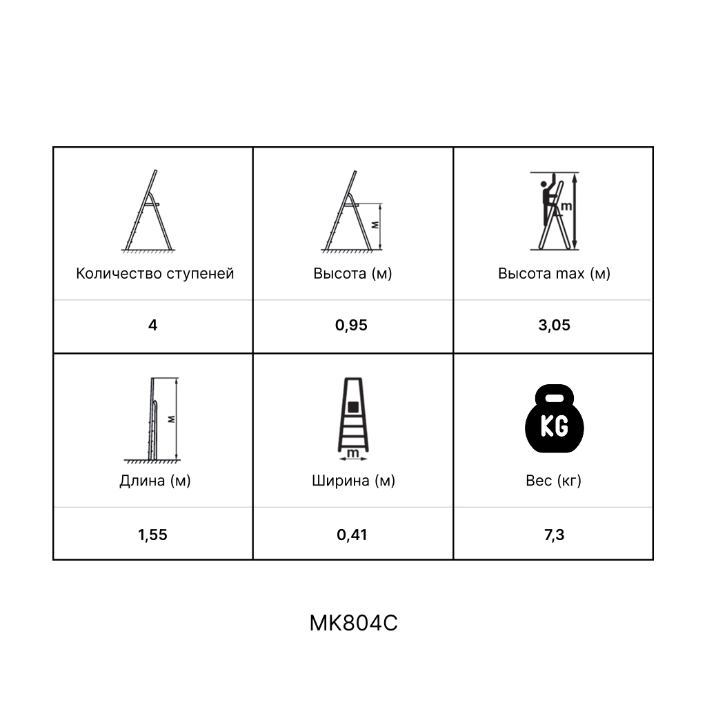 Тетива передней ноги, задняя нога и ступени выполнены из стального профиля, защищенного от коррозии порошковой краской. Задняя и передняя ноги соединены между собой. Ступени имеют рифленую поверхность (стремянки серии МК С – имеют противоскользящие накладки). Башмаки изготовлены из высокопрочного пластика. Стремянка в рабочем положении должна быть полностью раскрыта, верхняя ступень плотно лежать на трубке задней ноги.